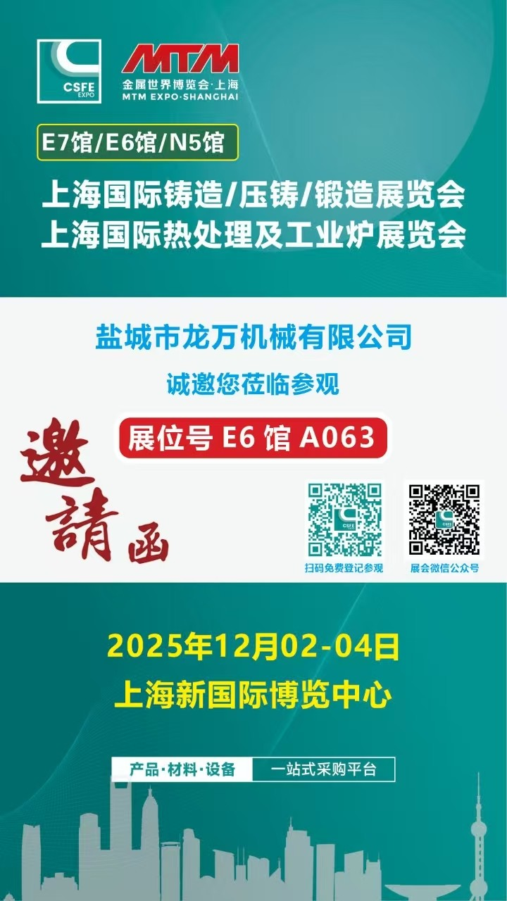 A Yancheng Longwan Machinery Co., Ltd. 2025. december 2. és 4. között részt vesz a „Sanghaji Nemzetközi Acél/Összeöntés/Öntödei Kiállításon” és a „Sanghaji Nemzetközi Hőkezelési és Ipari Kemencekiállításon” a Sanghaji Nemzetközi Kiállítási Központban 2025. december 2-4. A Yancheng Longwan Machinery Co., Ltd. ezt a platformot fogja használni legújabb technológiáinak és innovatív termékeinek bemutatására a gépgyártás területén.